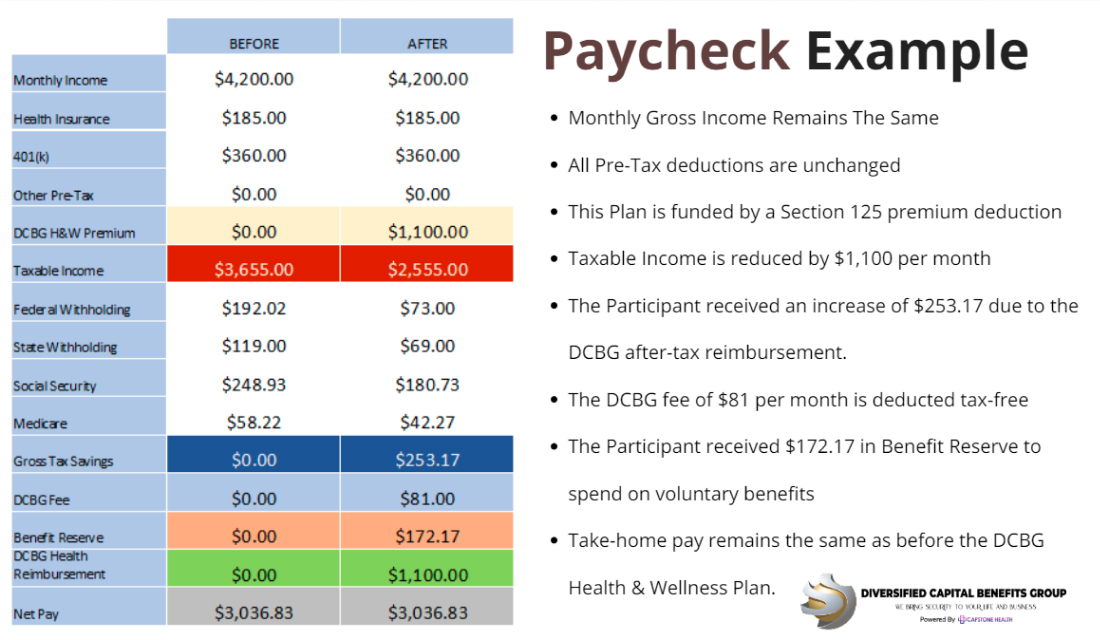 Each pay period, a pre-tax deduction is taken from every employee's paycheck. With the adjusted gross income reduced due to this pre-tax deduction, taxes are calculated accordingly, resulting in a decreased tax burden for employees. Additionally, participation in a monthly healthcare activity triggers a CPT code and explanation of benefits, leading to a post-tax benefit added to their paycheck. This combination ultimately increases the employee's take-home pay.